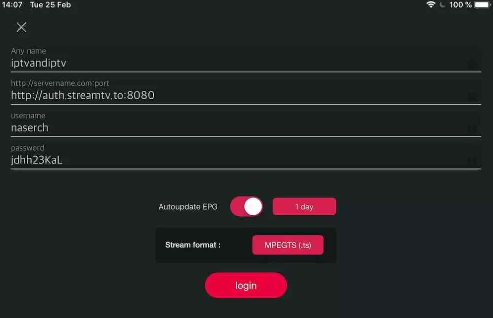 For the first field Choose a name for your list (it can be any name ), Then enter your username, password and URL we provided to you Turn ON Autoupdate EPG and click LOGIN